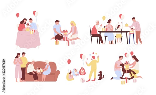 Collection Of People Celebrating First Birthday Of Their Baby Bundle Of Family Party Scenes With Infant Child Opening Gifts Eating Cake Having Fun During Celebration Cartoon Vector Illustration Buy This Stock