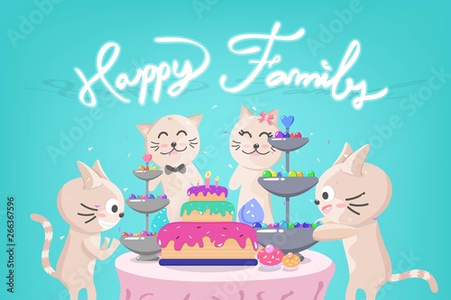 Happy Birthday Party Cute Kitten Family Celebration Confetti Falling Adorable Animal Cat Cartoon Characters Collection Holiday Background Vector Illustration Buy This Stock Vector And Explore Similar Vectors At Adobe Stock