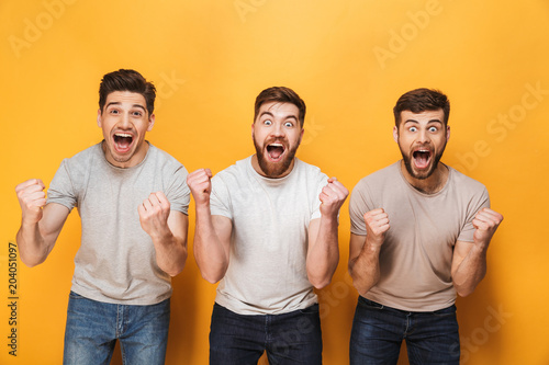 Portrait Of A Two Cheerful Young Men Celebrating Success Together Isolated Over Yellow Background
