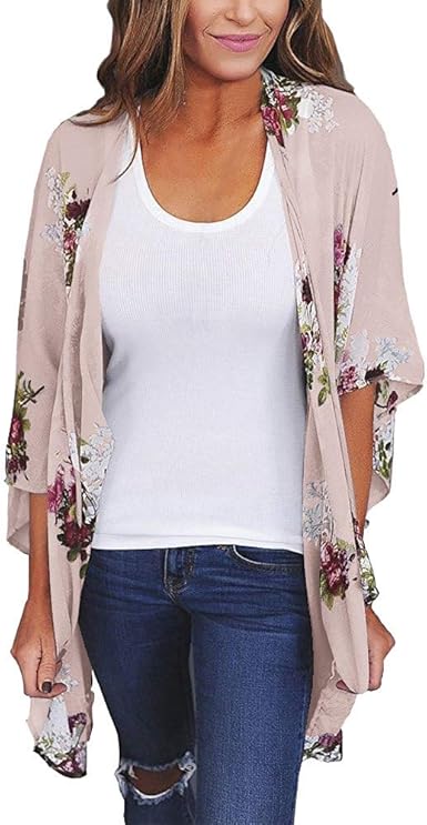 Nrealy Cardigan Womens Chiffon Shawl Floral Print Kimono Cardigan Top Cover Up Blouse Beachwear Pink B07pgy4k3y