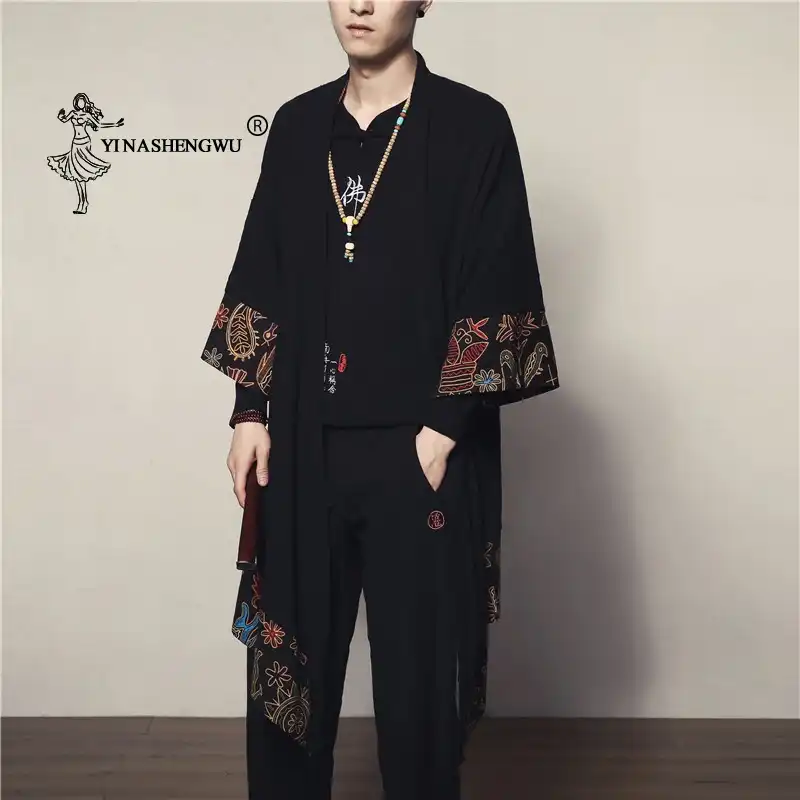 Chinese Kimono Cardigan Men Long Solid Linen Cardigan Streetwear Men Kimonos Jacket Coat Windbreaker Oriental Clothes Men Kk3056 Aliexpress