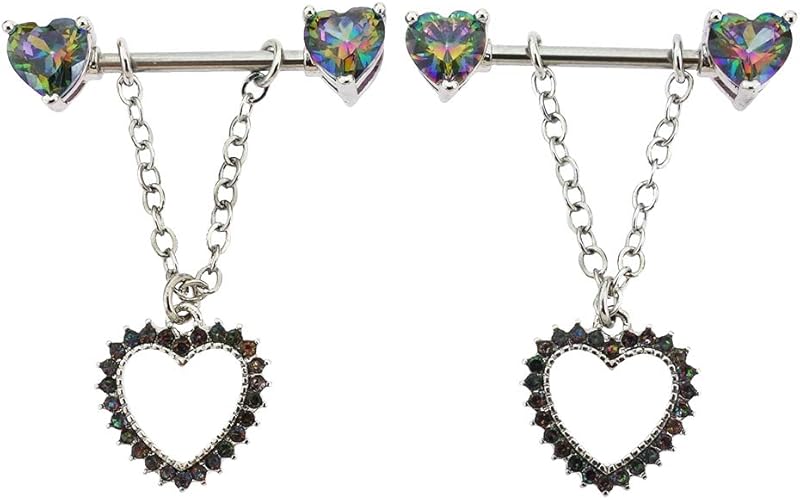 Amazon Com New Year Discountexcepro Barbell Rings 2pcs 316l Surgical Ss Multicolor Heart Cz Nipple Piercing Shiny Dangling Chains Nipple Rings Black Rainbow Stainless Steel Jewelry