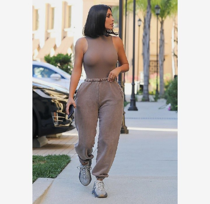 Kim Kardashian Braless Light Grey Crop Top Light Grey Sneakers Ribbed Hem High Rise Baggy Kim Kardashian Light Grey Printed Sweatpants 2019 Image 0 Sassy Daily Fashion News