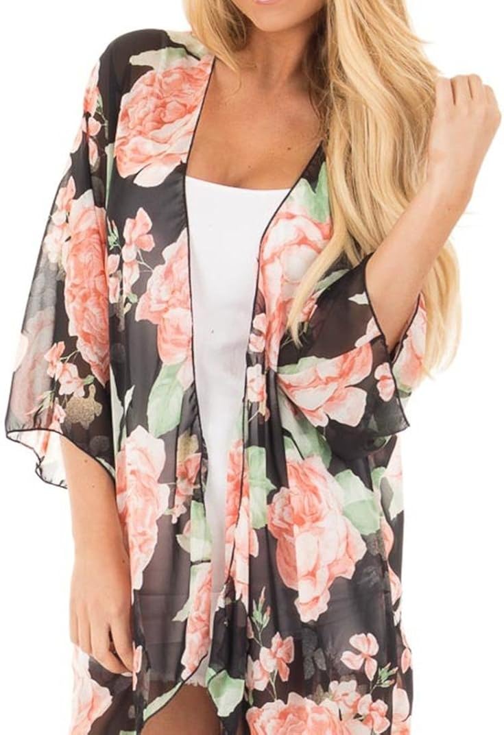 Womens Floral Print Sheer Chiffon Kimono Cardigan Blouse Loose Beach Cover Up Kimono Cardigan Chiffon Kimono Cardigan Loose Kimono